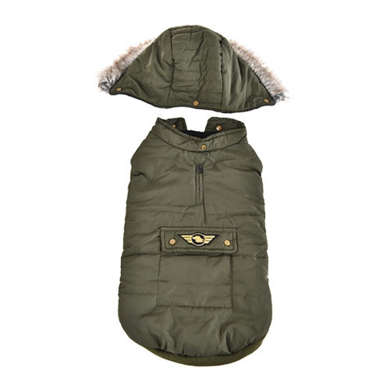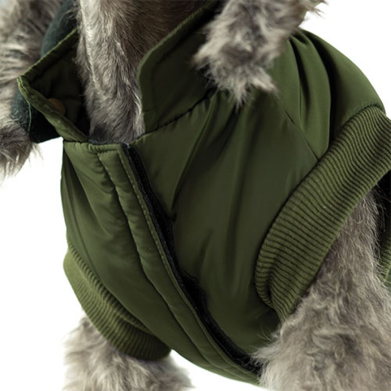 O casaco com capuz “Pilot” é o complemento ideal para os cães mais friorentos, pois é impermeável e tem um interior forrado de pelúcia quente. Possui um capuz removível, com pelo sintético.